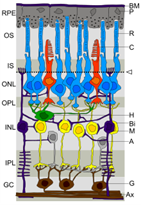 La capa de células del epitelio pigmentario, posee uniones selladas o hendidas (“uniones gap”). Por microscopía electrónica se ha podido observar que la superficie apical está cubierta por largas microvellosidades, que se interdigitan con los segmentos externos de los fotorreceptores cuyas prolongaciones abrazan hasta un tercio de la longitud de un segmento externo de un bastón y algo menos en el cono. No hay uniones anatómicas directas entre estas dos células. Los extremos de los segmentos externos de los bastones envían finas prolongaciones y se introducen unos cuantos micrómetros en el soma de la célula epitelial, que presenta a este nivel más invaginaciones anulares, llamada vaina de los bastones. Los conos foveales y parafoveales están también recubiertos por la prolongación epitelial, siendo estos envainamientos mucho más largos y complejos que los de los bastones, son proyecciones en forma de hoja que envuelven el segmento externo del cono y descansan una sobre la otra como los pétalos de una rosa.